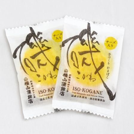 磯こがねは、特注のナチュラルチーズと濃厚な豆乳をたっぷりとすり身に練りんだ当店だけのオリジナル商品。蒸しあげたあと、鉄板で手焼きしています。トロリとしたナチュラルチーズと豆乳のふんわりとした風味、魚の旨味が口の中に広がります。